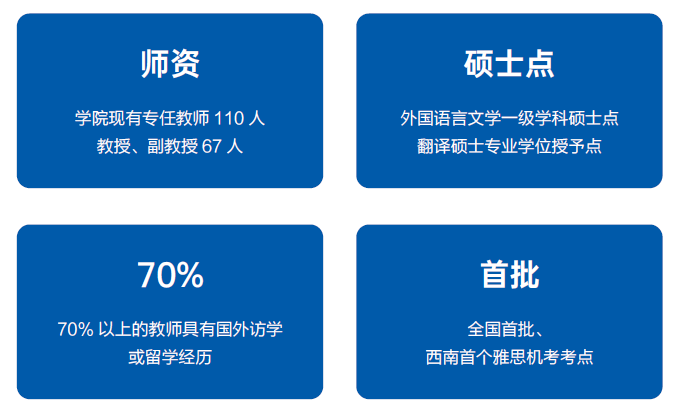 外国语学院作为电子科技大学的直属学院,形成了从本科生到硕士研究生教育,涵盖继续教育、国际留学生教育等多层次、多类型的人才培养格局。学院现有专任教师110人,教授、副教授67人。具有博士学位的教师51人,博士后4人,教育部师德标兵1人,教育部新世纪优秀人才入选者1人,文化名家暨“四个一批”人才1人,教育部高等学校教学指导委员会委员 1人,四川省教学名师1人,四川省学术与技术带头人1人、四川省学术与技术带头人后备人选4人,学院70%以上的教师均有在海外名校留学、访学的经历。