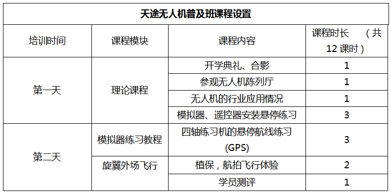 此课程学习周期两天,占用时间短,一个周末即可。价格经济实惠,普及无人机知识,一般人群均可学习。特别适合大学毕业生及对无人机行业感兴趣,对航拍等感兴趣的爱好者。