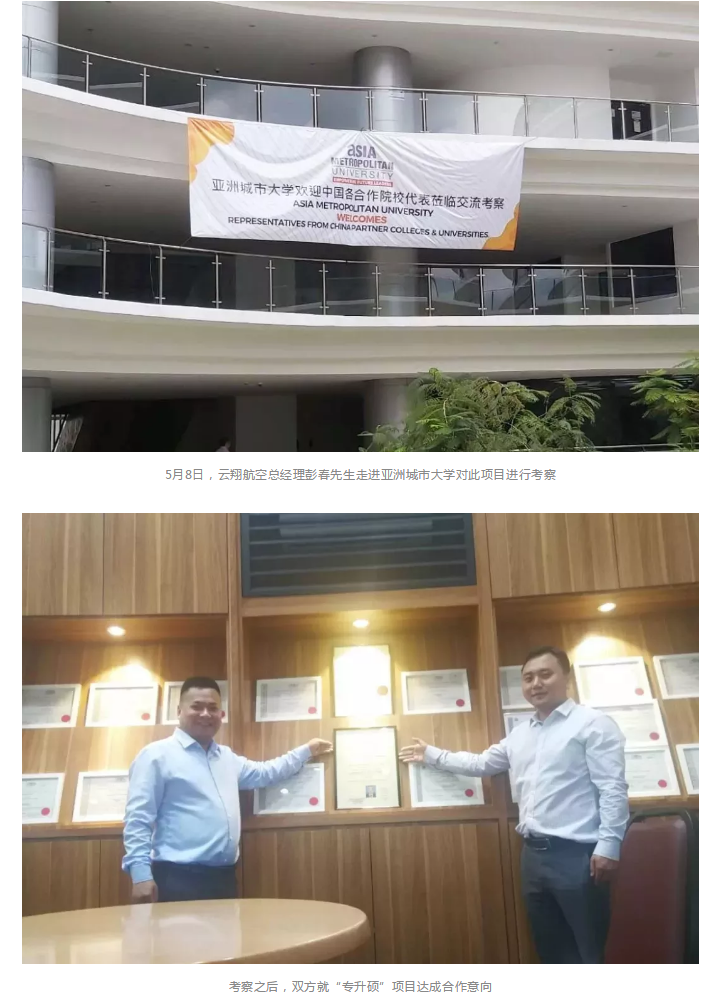 2019年5月8日,云翔航空走进亚洲城市大学,携手亚洲城市大学打造海外留学“专升硕”项目!入学门槛低、费用低、免联考!2年获取全日制硕士文凭!