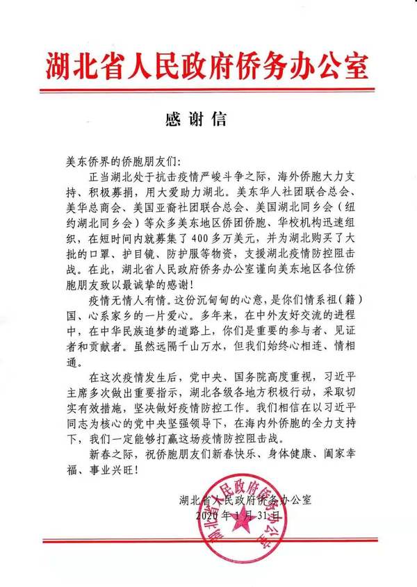 正当湖北处于抗击疫情严峻斗争之际,海外侨胞大力支持、积极募捐,用大爱助力湖北。美东华人社团联合总会、美华总商会、美国亚裔社团联合总会、美国湖北同乡会(纽约湖北同乡会)等众多美东地区侨团侨胞、华校机构迅速组织,在短时间内就募集了400多万美元,并为湖北购买了大批的口罩、护目镜、防护服等物资,支援湖北疫情防控阻击战。在此,湖北省人民政府侨务办公室谨向美东地区各位侨胞朋友致以最诚挚的感谢!