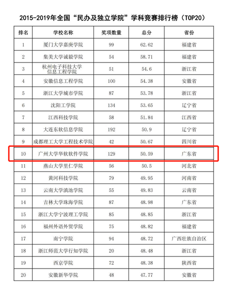 2月22日,中国高等教育学会《高校竞赛评估与管理体系研究》专家工作组发布“2015-2019年和2019年全国普通高校学科竞赛排行结果”。其中,包含本科院校榜单12个、高职院校榜单11个,省份榜单2个。榜单1-11为2015-2019年全国“民办及独立学院”学科竞赛排行榜(TOP20),广东省内仅有广州大学华软软件学院、吉林大学珠海学院入围,其中,广州大学华软软件学院位居全国第十名、广东省内同类院校第一名。
