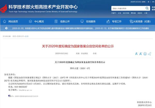 科技部关于2020年度拟确定为国家备案众创空间名单的公示