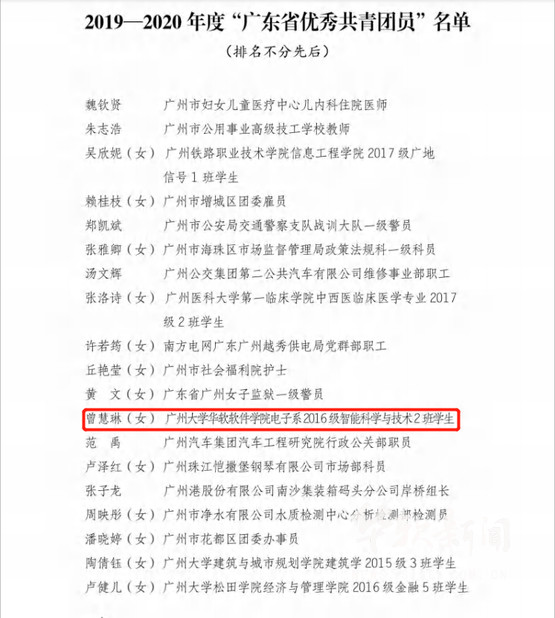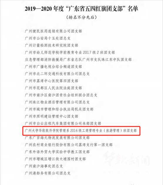 近日,共青团广东省委员会公布了2019-2020年度广东省共青团优秀个人和集体评优活动的入选名单,华软学院获多个奖项。其中,学生会获“广东省优秀学生会”荣誉称号,学院管理系16级工商管理(旅游管理)班团支部获“广东省五四红旗团支部”荣誉称号,电子系曾慧琳同学获“广东省优秀共青团员”荣誉称号。