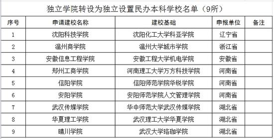 2、独立学院转设为独立设置民办本科学校名单(9所)