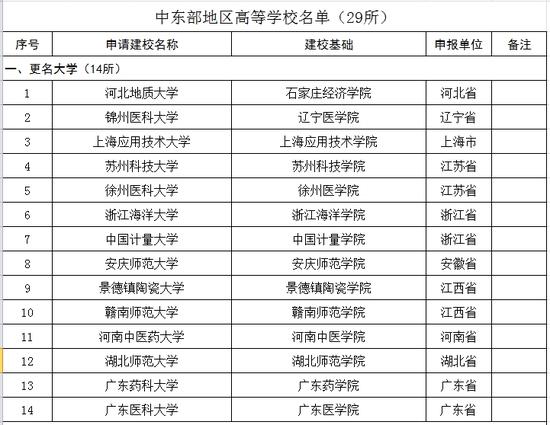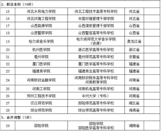 1月26日,教育部网站公示2016年拟批准设置的高等学校名单,39所高校申请获得通过,其中:中东部地区高等学校29所(14所学院更名为大学,14所专科升为本科,1所合并调整),独立学院转设为独立设置民办本科学校9所,经过筹建“去筹”正式设立高等学校1所。