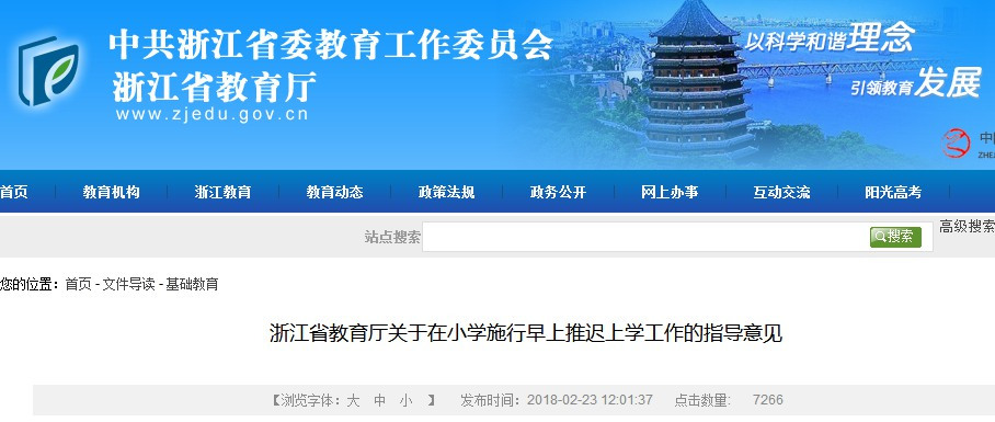 前不久,浙江省教育厅出台《关于在小学施行早上推迟上学工作的指导意见》,要求全省范围内在小学施行早上推迟上学,规定小学不得早于8:00组织学生上课,小学一二年级上午上课时间不得早于8:30,以确保小学生每天有10小时充分的睡眠时间、充裕的早餐时间、从容的上学时间。