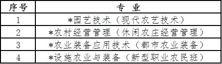 退役军人、下岗失业人员、农民工和新型职业农民等群体考生可根据自身实际,按专业报考条件,报考北京农业职业学院2019年自主招生以下4个专业(带*号的专业为涉农专业,免收学费):
