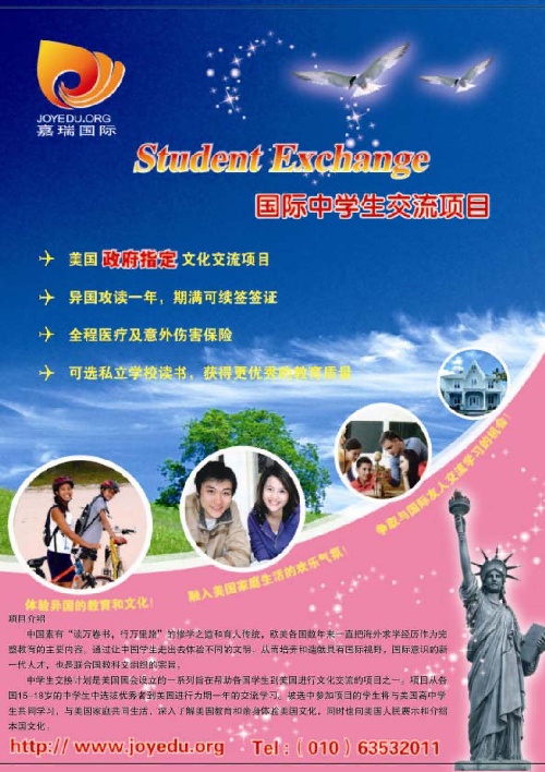 这是美国政府制定的文化交流项目。 学生持访问学者签证,享受美国政府的项目支持,在美国完成半年到一年的中学课程。我们希望在全国范围内寻找代理合作单位。如下是项目简介。欢迎联系我们获取详细资料。