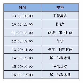 特设阅读时间、观影时间、作业自习时间、集体活动时间,让孩子一天丰富充实而快乐;既有知识增长,又避免沉迷网络,参与武术锻炼,强健身心;结交同龄好友,避免假期孤独,集体协作活动,培养孩子与人协作的社会性。
